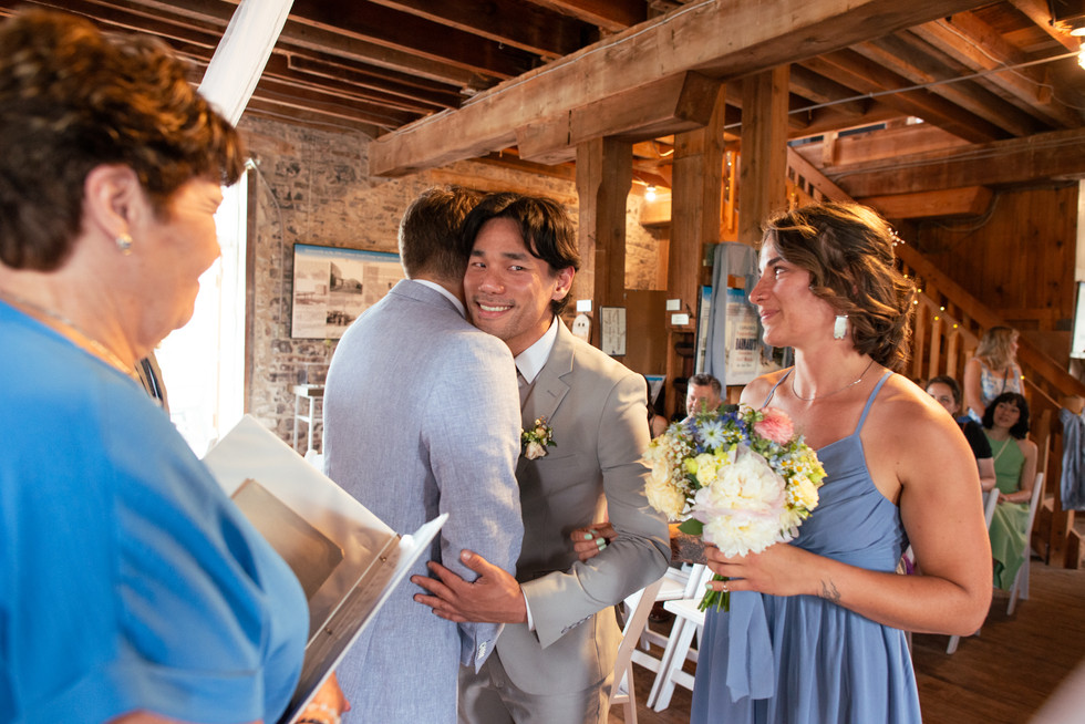 The ceremony took place in the Spencerville Mill, one of the most beautiful and historic venues in the area. Light streamed in through tall windows, illuminating the original wooden beams and textured brick. The setting was intimate and full of charm — an absolute dream to photograph.
